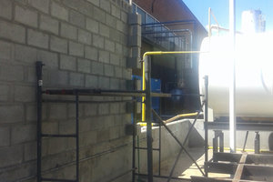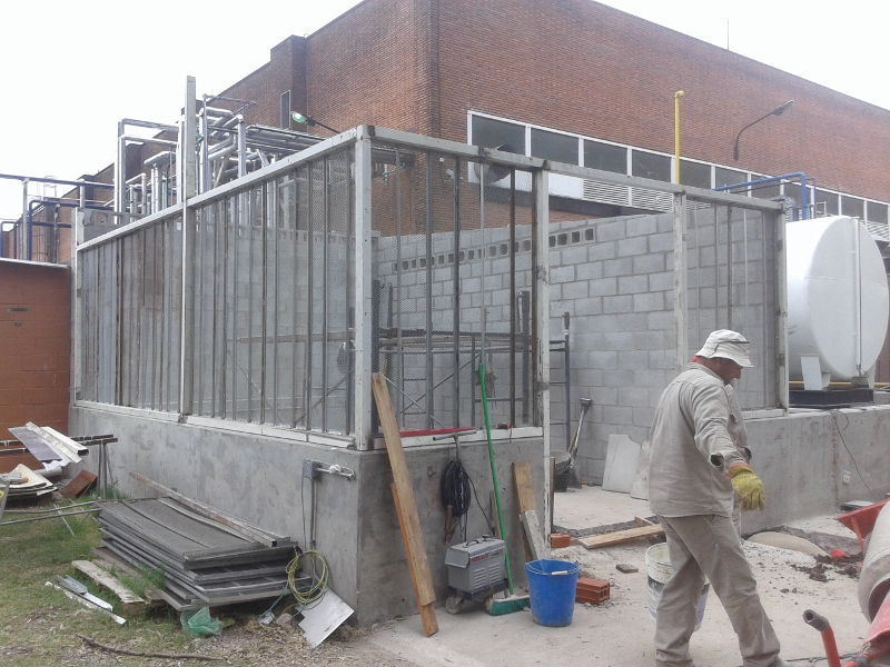 Construcción de cuarto para residuos especiales. Mamposterias de hormigón, estructuras metálicas, cámaras de desagote y rejillas tipo guardaganado en acero galvanizado.